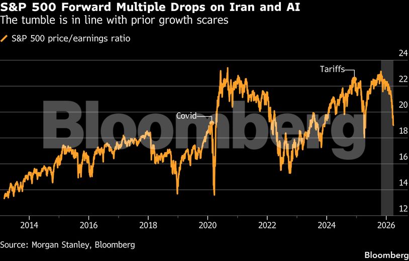 Ο S&P 500 έχει υποχωρήσει κατά 8,4% από τις 27 Ιανουαρίου. Οι μετοχές έχουν πληγεί από τους φόβους σχετικά με την τεχνητή νοημοσύνη και τον πόλεμο, ο οποίος έχει ουσιαστικά κλείσει τα Στενά του Ορμούζ και έχει διακόψει μια κρίσιμη διαδρομή για τις παγκόσμιες προμήθειες ενέργειας.