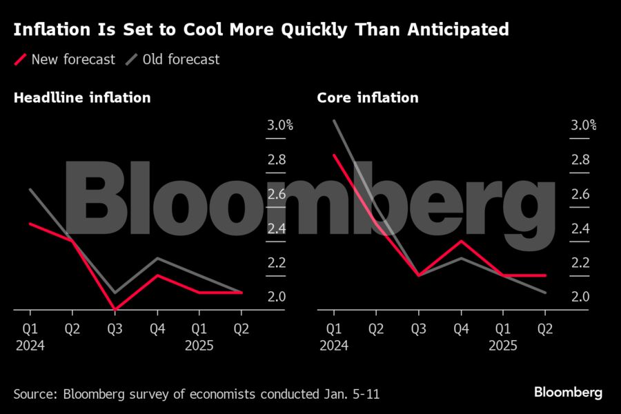 Οι οικονομολόγοι αναμένουν τώρα ταχύτερη υποχώρηση της αύξησης των τιμών – στο 2,3% το 2024. Πρόκειται για αναθεώρηση προς τα κάτω κατά 0,3 ποσοστιαίες μονάδες σε σύγκριση με την έρευνα του περασμένου μήνα. Εξακολουθούν να βλέπουν ένα δύσκολο δρόμο μπροστά τους, καθώς ο πληθωρισμός επιταχύνεται εκ νέου το τέταρτο τρίμηνο από το επίπεδο-στόχο για να φτάσει κατά μέσο όρο στο 2,1% το 2025.
