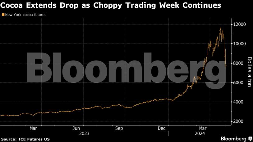 Οι τιμές του κακάο υποχώρησαν και πάλι, παρατείνοντας μια εβδομάδα ακραίας μεταβλητότητας, καθώς η ρευστότητα στερεύει και οι αγοραστές αποφεύγουν την αγορά κόκκων κακάο.