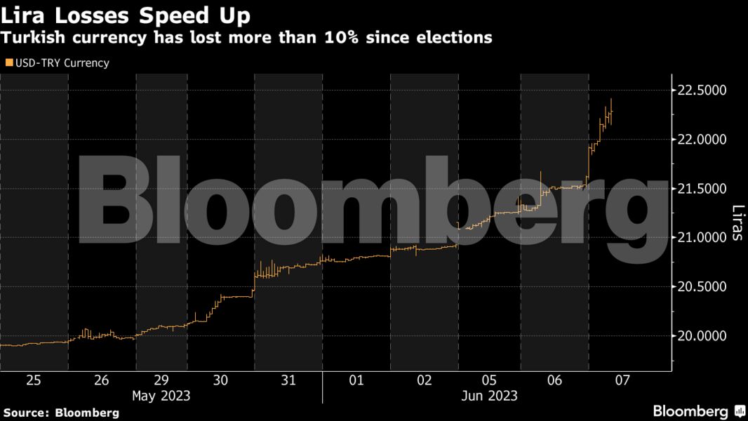 Ο διορισμός από τον πρόεδρο Ρετζέπ Ταγίπ Ερντογάν του πρώην στρατηγικού αναλυτή της Merrill Lynch Μεχμέτ Σιμσέκ ως νέου υπουργού Οικονομίας πυροδότησε προσδοκίες για επιστροφή σε μια πιο ορθόδοξη νομισματική πολιτική και αύξησε την προοπτική μειωμένων παρεμβάσεων στις αγορές. Από τον δεύτερο γύρο των εκλογών στην Τουρκία στις 28 Μαΐου, η λίρα έχει υποχωρήσει περισσότερο από 10% έναντι του δολαρίου.