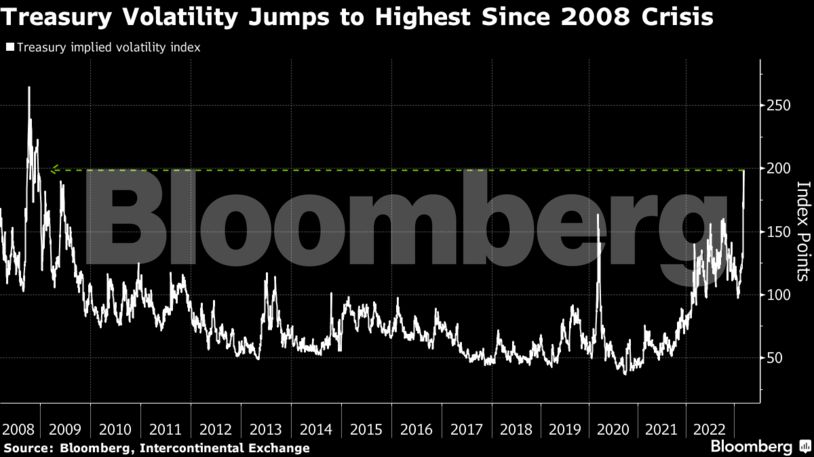 Ο δείκτης MOVE ο οποίος μελετά την υποκείμενη μεταβλητότητα των κρατικών ομολόγων ΗΠΑ αυξήθηκε στις 199 μονάδες την Τετάρτη, υψηλό 15ετίας από την παγκόσμια οικονομική κρίση του 2008. Οι αποδόσεις των 2ετών ομολόγων ΗΠΑ, τα οποία θεωρούνται ως μερικά από τα ασφαλέστερα ομόλογα του κόσμου, έχουν μεταβληθεί μεταξύ του 3,71% και του 4,53% αυτή την εβδομάδα.