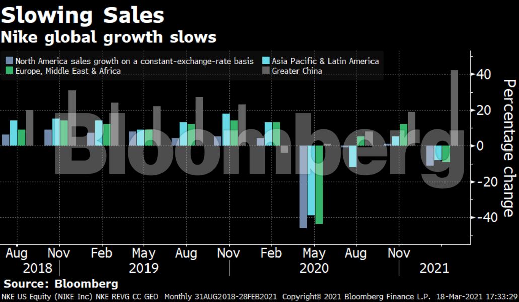 Η ανάκαμψη της Nike από τις οικονομικές επιπτώσεις της πανδημίας επιβραδύνθηκε το περασμένο τρίμηνο, καθώς τα προβλήματα στην αλυσίδα εφοδιασμού εμπόδισαν τα προϊόντα να φτάσουν στη Βόρεια Αμερική, τη μεγαλύτερη αγορά της εταιρείας.