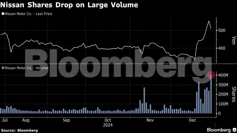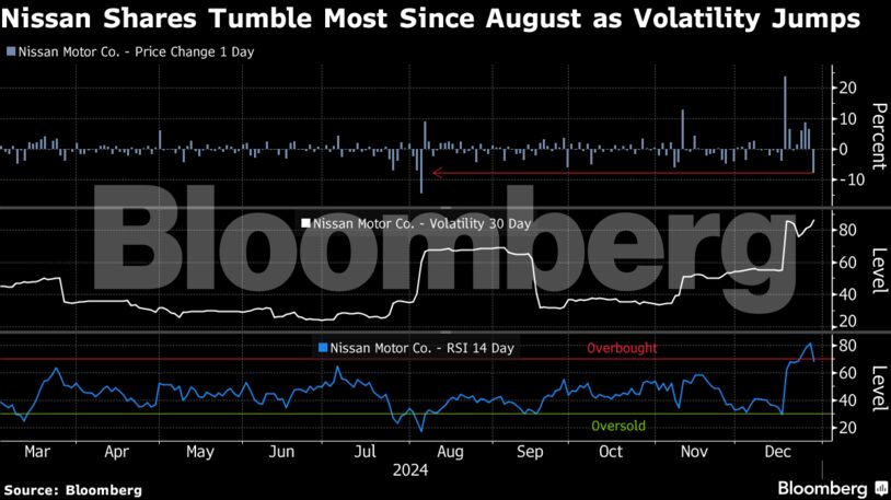 Η μετοχή της Nissan ήταν ασταθής από τότε που κυκλοφόρησε η είδηση του deal με τη Honda, σημειώνοντας κέρδη 24% στις 18 Δεκεμβρίου, στη μεγαλύτερη ενδοσυνεδριακή άνοδο εδώ και τουλάχιστον πέντε δεκαετίες. Η ιστορική μεταβλητότητα των 30 ημερών έχει «εκτοξευθεί» στο υψηλότερο επίπεδο των τελευταίων 16 ετών.