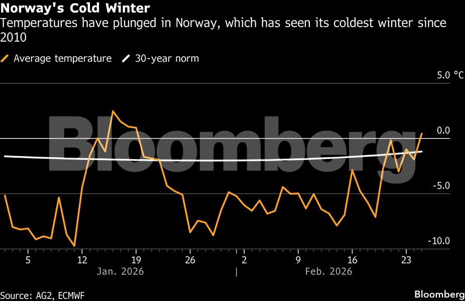 Ο παρατεταμένος χειμώνας αύξησε τη ζήτηση ενέργειας, με το Όσλο να καταγράφει πάνω από 30 συνεχόμενες ημέρες με θερμοκρασίες κάτω από το μηδέν. Ταυτόχρονα, η παραγωγή αιολικής ενέργειας μειώθηκε σημαντικά, καθώς οι άνεμοι ήταν ασθενέστεροι από τα κανονικά επίπεδα. Προς το παρόν, το ενεργειακό έλλειμμα στηρίζει τις τιμές και τα συμβόλαια ενέργειας. Ωστόσο, το χρονικό περιθώριο για την αναπλήρωση των αποθεμάτων στενεύει.