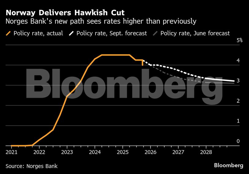 Η Norges Bank μείωσε το βασικό επιτόκιο κατά 25 μονάδες βάσης, στο 4%, σε μια απόφαση που προέβλεπαν 12 από τους 19 αναλυτές σε έρευνα του Bloomberg. Οι υπόλοιποι εκτιμούσαν ότι θα έμεναν αμετάβλητα τα επιτόκια.