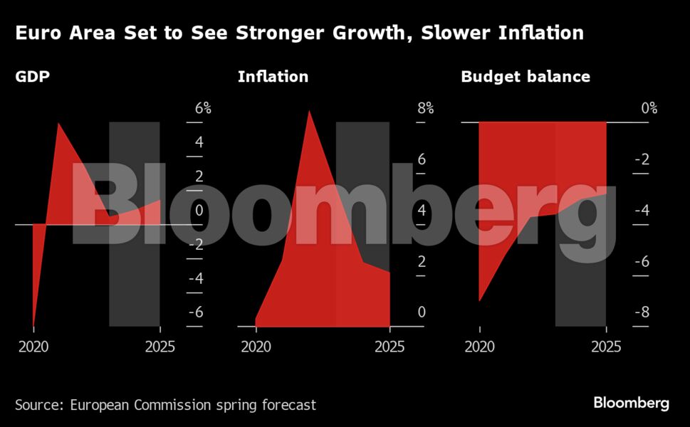 Η ευρωζώνη επεκτάθηκε κατά 0,3% το πρώτο τρίμηνο, βγαίνοντας από μια ρηχή ύφεση χάρη στις ισχυρότερες του αναμενόμενου επιδόσεις των μεγάλων οικονομιών της. Η Ευρωπαϊκή Επιτροπή βλέπει ανάπτυξη κατά 0,8% φέτος και κατά 1,4% το 2025.