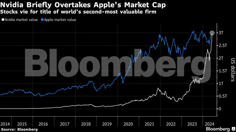 Η Nvidia έσπασε επίσης το ορόσημο των 3 τρισεκατομμυρίων δολαρίων σε κεφαλαιοποίηση την Τετάρτη, μετά την άνοδο της μετοχής της πάνω από 5%. Στο κλείσιμο της αγοράς, η Nvidia είχε αξία 3,019 τρισεκατομμυρίων δολαρίων, έναντι της Apple, της οποίας η αξία είχε διαμορφωθεί σε 2,99 τρισεκατομμύρια δολάρια. Η Microsoft είναι η πιο πολύτιμη εισηγμένη εταιρεία, με κεφαλαιοποίηση 3,15 τρισεκατομμυρίων δολαρίων, από την Τετάρτη.