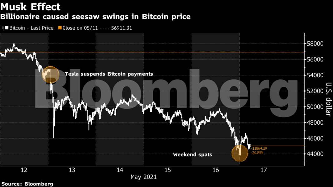 Την περασμένη Τετάρτη, ο Μασκ «έκοψε» περίπου 10.000 $ από την τιμή του Bitcoin μέσα σε λίγες μόνο ώρες καθώς είπε ότι η Tesla δεν θα το δεχόταν πλέον ως μέσο πληρωμής. Στην ίδια ανακοίνωση, ο μεγιστάνας ανέφερε ότι η εταιρεία δεν θα πουλούσε τις συμμετοχές της.