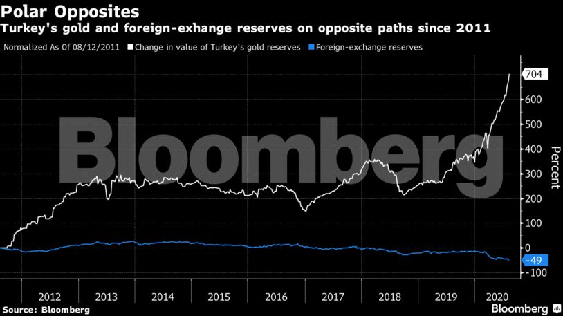 Η αξία των αποθεμάτων χρυσού της Τουρκίας αυξήθηκε σε υψηλό όλων των εποχών την εβδομάδα έως τις 7 Αυγούστου, για να πέσει 5% την εβδομάδα αργότερα, η μεγαλύτερη πτώση σε πέντε μήνες. «Η κεντρική τράπεζα ήταν πάντα ο μοναδικός μας αγοραστής από τότε που άλλαξε η νομοθεσία», δήλωσε ο Γιουσέλ, προβλέποντας ότι η τάση είναι απίθανο να αλλάξει φέτος. Η αξία των αποθεμάτων της κεντρικής τράπεζας έχει αυξηθεί και τα συναλλαγματικά αποθέματα μειώθηκαν σε χαμηλά 15 ετών σε μια προσπάθεια να υποστηρίξει την αποδυνάμωση της λίρας.