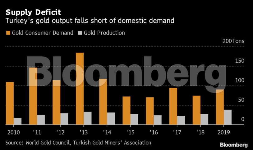 Στο χρυσό καταφεύγει η Τουρκία σε μια προσπάθεια να στηρίξει την οικονομία. Η Τουρκία θα παράξει ρεκόρ χρυσού φέτος και η κεντρική τράπεζα πιθανότατα θα τον αγοράσει όλο – σε τιμές κοντά στα υψηλότερα επίπεδα. Η παραγωγή από έναν από τους κορυφαίους αγοραστές του πολύτιμου μετάλλου στον κόσμο αναμένεται να αυξηθεί 16% σε 44 τόνους φέτος, δήλωσε ο Χασάν Γιουκέλ, επικεφαλής της Τουρκικής Ένωσης Μεταλλείων Χρυσού. Η νομοθεσία που θεσπίστηκε το 2017 δίνει στην κεντρική τράπεζα το δικαίωμα άρνησης αγοράς χρυσού που εξορύσσεται στη χώρα σε ισχύουσες τιμές αγοράς.