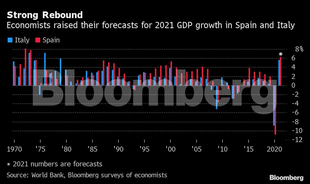 Ρεκόρ τεσσάρων δεκαετιών αναμένεται να καταγράψει η οικονομική ανάκαμψη σε Ιταλία και Ισπανία φέτος, δίνοντας ώθηση στις δύο χώρες του ευρωπαϊκού νότου προκειμένου να ξεπεράσουν τη βαθιά ύφεση του 2020.