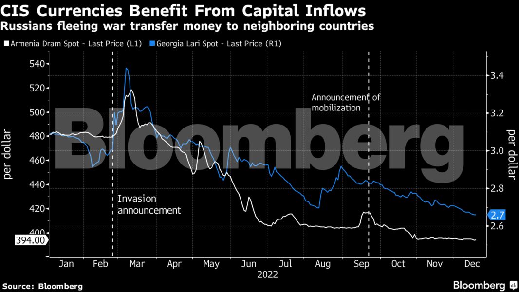 Τα κέρδη των παραπάνω νομισμάτων δεν ήταν δεδομένα στην αρχή του πολέμου και οι γείτονες της Ρωσίας αναμενόταν να υποφέρουν καθώς ο μεγαλύτερος εμπορικός τους εταίρος λύγισε υπό το βάρος των διεθνών κυρώσεων. Στην πραγματικότητα, οι τεράστιες εισροές κεφαλαίων ενίσχυσαν τα συναλλαγματικά τους αποθέματα και βελτίωσαν το ισοζύγιο τρεχουσών συναλλαγών τους. Η οικονομία της Αρμενίας αναπτύχθηκε με διψήφιο ποσοστό το δεύτερο και τρίτο τρίμηνο, ενώ η οικονομία της Γεωργίας σημείωσε ανάπτυξη σχεδόν 10% στο τρίτο τρίμηνο του έτους.
