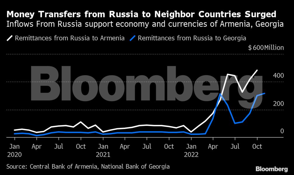 Ο πόλεμος εξηγεί την πενταπλάσια αύξηση των εμβασμάτων που έχουν εισρεύσει στη Γεωργία από τη Ρωσία μέχρι στιγμής φέτος, που ισοδυναμεί με περισσότερο από το 60% όλων των μεταφορών και υπερβαίνει τα 1,75 δισεκατομμύρια δολάρια, σύμφωνα με την Εθνική Τράπεζα της Γεωργίας. Οι μεταφορές χρημάτων στην Αρμενία ανήλθαν σε 2,8 δισεκατομμύρια δολάρια το πρώτο δεκάμηνο, δηλαδή σχεδόν τετραπλασιάστηκαν σε σύγκριση με την ίδια περίοδο του 2021. Τον Οκτώβριο, έφθασαν στο υψηλότερο επίπεδο τουλάχιστον από το 2004, σύμφωνα με την κεντρική Τράπεζα της Αρμενίας.