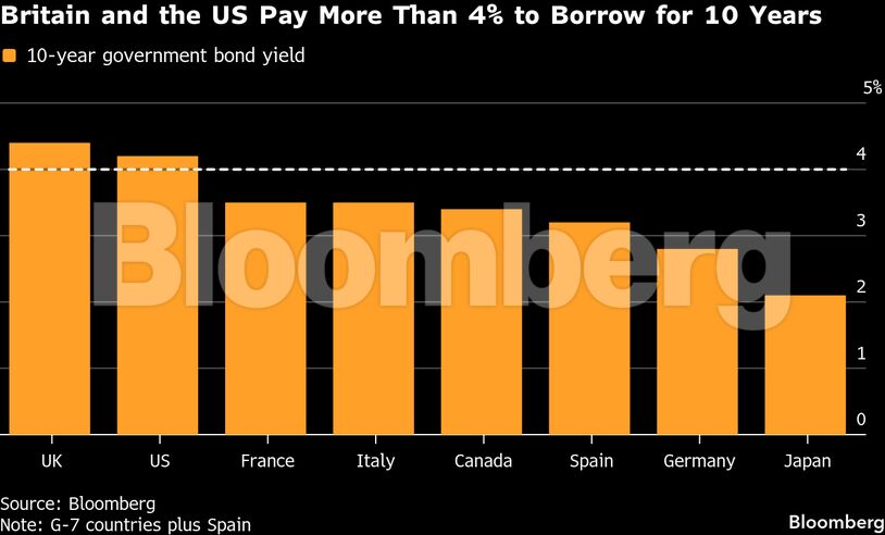Η απόδοση του 10ετούς ομολόγου αναφοράς στο Ηνωμένο Βασίλειο παραμένει πάνω από 4%, μετά την απότομη άνοδο τον περασμένο Ιούλιο, ένα επεισόδιο που θυμίζει την κατάρρευση της αγοράς ομολόγων το 2022, η οποία κόστισε τη θέση της πρώην πρωθυπουργού Λιζ Τρας. Το αντίστοιχο επιτόκιο στις ΗΠΑ είναι ελάχιστα χαμηλότερο. Η Γαλλία, εν τω μεταξύ, έχει από τις υψηλότερες αποδόσεις στην Ευρωζώνη, έχοντας υποβαθμιστεί η πιστοληπτική της ικανότητα από τους S&P Global και Fitch, μεταξύ άλλων, εν μέσω του αδιεξόδου στον προϋπολογισμό.