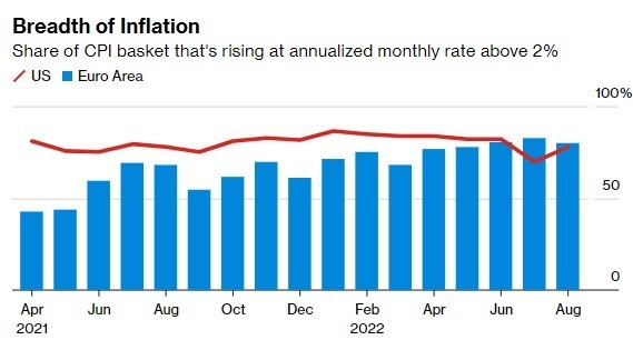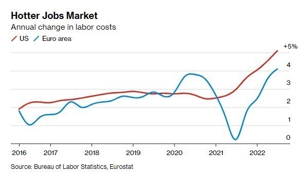 Λαμβάνοντας υπόψη τα παραπάνω, καταλήγουμε στο συμπέρασμα ότι η Ευρώπη έχει ένα τελείως διαφορετικό είδος πληθωρισμού σε σχέση με τις ΗΠΑ. Προέρχεται σχεδόν εξ ολοκλήρου από τις εκτοξευόμενες τιμές των εμπορευμάτων και όχι από την εύρωστη καταναλωτική δαπάνη ή τη σφιχτή αγορά εργασίας (όπως συμβαίνει στις ΗΠΑ).