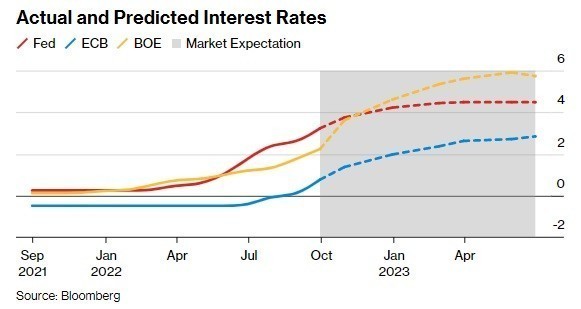«Ο πληθωρισμός θα χρειαστεί περισσότερο χρόνο για να υποχωρήσει στην Ευρώπη σε σχέση με τις ΗΠΑ, εν μέρει εξαιτίας του γεγονότος ότι η Ευρώπη θα συνεχίσει να υποφέρει από το σοκ στις ενεργειακές προμήθειες» αναφέρει η Capital Economics. «Παρότι περιμένουμε ότι η Fed θα κόψει τα επιτόκια στο β’ εξάμηνο του 2023, αμφιβάλουμε ότι θα τον κάνουν η ΕΚΤ και η Τράπεζα της Αγγλίας (ΒοΕ) πριν το 2024».