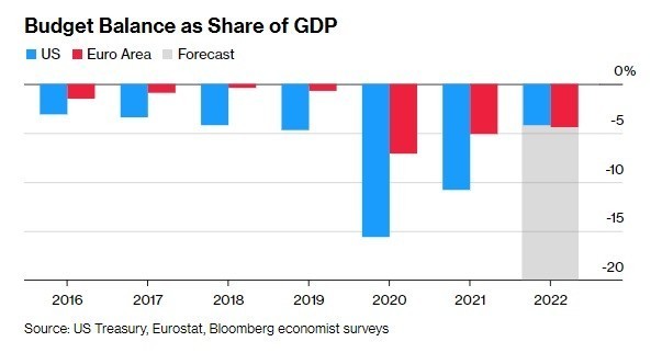 Και μην ξεχνάμε ότι η δημοσιονομική πολιτική στην Ευρωζώνη κινείται αντίρροπα της νομισματικής, καθώς οι κυβερνήσεις αναγκάζονται να ανοίξουν τις κάνουλες του χρήματος, προκειμένου να αντιμετωπίσουν το υψηλό κόστος ενέργειας. Έτσι, τα επίπεδα διαβίωσης των Ευρωπαίων αναμένεται να υποχωρήσουν αισθητά κάτω των επιπέδων διαβίωσης των Αμερικανών.