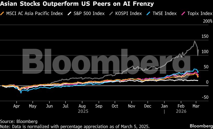 Ο πόλεμος με το Ιράν έχει επηρεάσει δυσανάλογα τις ασιατικές μετοχές, εν μέρει λόγω της υπερβολικής εξάρτησης της περιοχής από τις μεταφορές καυσίμων μέσω των Στενών του Ορμούζ. Υπάρχει επίσης αυξανόμενη ανησυχία ότι μια παρατεταμένη κρίση εφοδιασμού μπορεί να προκαλέσει παγκόσμια οικονομική επιβράδυνση, υπονομεύοντας βασικές εξαγωγικές βιομηχανίες. Ως αποτέλεσμα, οι επενδυτές αποκομίζουν κέρδη από την πρόσφατη άνοδο που προκάλεσε η τεχνητή νοημοσύνη, ιδίως στις χώρες που είχαν την καλύτερη απόδοση το περασμένο έτος: τη Νότια Κορέα και την Ταϊβάν.