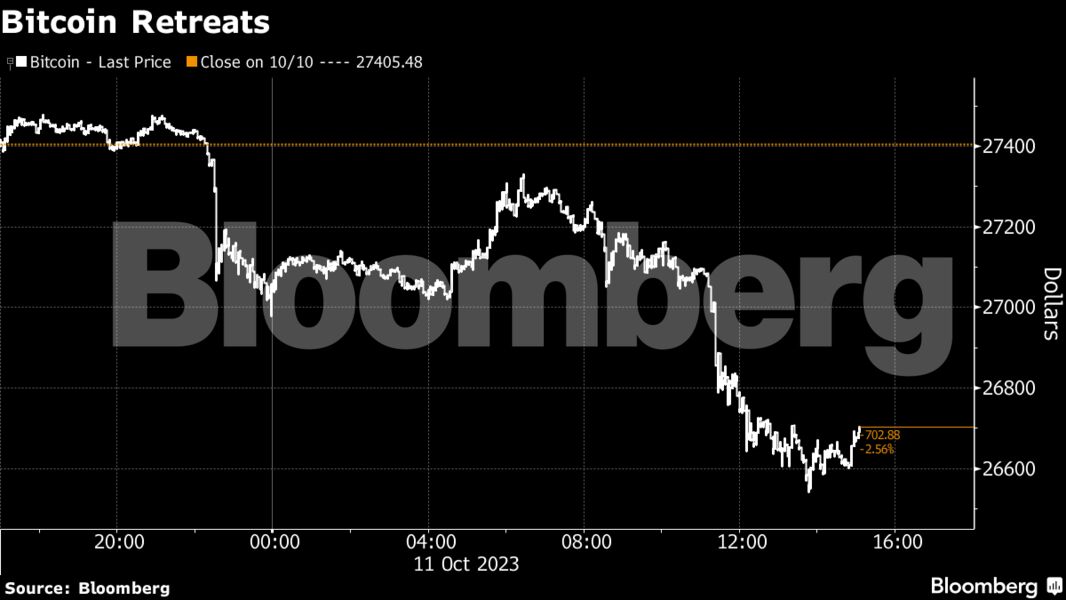 Το Bitcoin υποχώρησε για πέμπτη συναπτή ημέρα την Τετάρτη, πέφτοντας κάτω από τα 27.000 δολάρια για πρώτη φορά από τον Σεπτέμβριο, με τους traders να επικαλούνται τη σύγκρουση στη Μέση Ανατολή ως παράγοντα που επιβαρύνει το κλίμα των επενδυτών.
