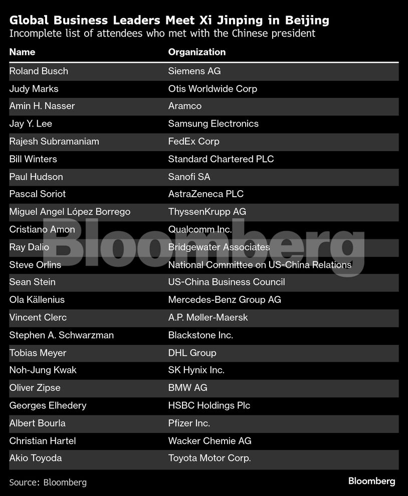 Οι παρευρισκόμενοι εκπροσωπούν εταιρείες από τις ΗΠΑ, την Ευρώπη, την Ιαπωνία και τη Νότια Κορέα και ορισμένοι μοιράστηκαν απόψεις τις οποίες ο Σι δήλωσε ότι η κινεζική κυβέρνηση θα «μελετήσει και θα εξετάσει». Κινέζοι αξιωματούχοι που εποπτεύουν την οικονομία, το εμπόριο και την εθνική ανάπτυξη συμμετείχαν στη συνάντηση, υπογραμμίζοντας τη σημασία που αποδίδει ο Σι στην εκδήλωση.