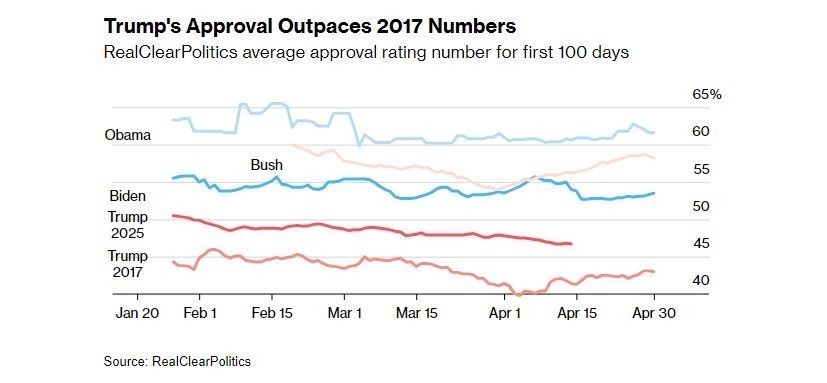 Παρότι οι δημοσκοπήσεις δείχνουν ότι οι ψηφοφόροι ανησυχούν για τις επιπτώσεις των δασμών και την πορεία της οικονομίας — με την καταναλωτική εμπιστοσύνη να καταγράφει χαμηλό πενταετίας — ο Τραμπ απέδωσε τα αρνητικά ευρήματα σε προκατάληψη των μέσων. Επιχείρησε, παράλληλα, να συσπειρώσει τη βάση του, παρουσιάζοντας τους δασμούς ως «αναγκαία θυσία» ενόψει του επερχόμενου φορολογικού του νομοσχεδίου, το οποίο προβλέπει μεταξύ άλλων κατάργηση φόρων σε φιλοδωρήματα, ώρες υπερωρίας και παροχές κοινωνικής ασφάλισης.