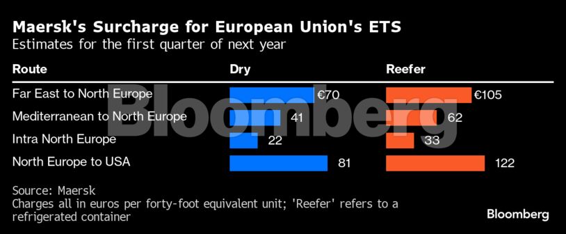 Το 2024, ένα πλοίο το οποίο μεταφέρει εμπορευματοκιβώτια μεταξύ της Ευρώπης και της Ασίας θα μπορούσε να επιβαρυνθεί με τέλη 810.000 ευρώ λόγω του ETS, σύμφωνα με την DNV, η οποία έχει ως βάση αναφοράς τιμή άνθρακα η οποία θα κυμαίνεται στα 90 ευρώ/τόνο.