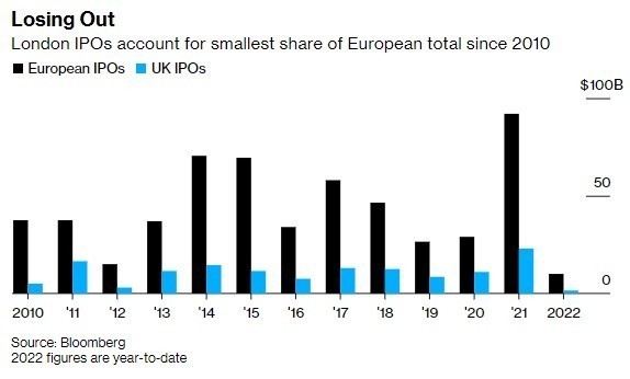Η μέχρι στιγμής πτώση των μετοχών στο Χρηματιστήριο του Λονδίνου (-8% μέσα στο 2022) έχει περιορίσει σημαντικά την κεφαλαιοποίηση. Και δυστυχώς, έπεται και συνέχεια. Είναι χαρακτηριστικό ότι αυτήν τη στιγμή η απόσταση από τη δεύτερη μεγαλύτερη αγορά, δηλαδή αυτή του Παρισιού, βρίσκεται μόλις στα 156 δισ. δολάρια, το χαμηλότερο επίπεδο όλων των εποχών.