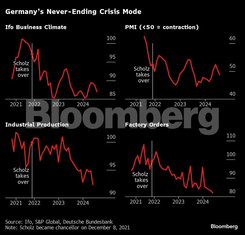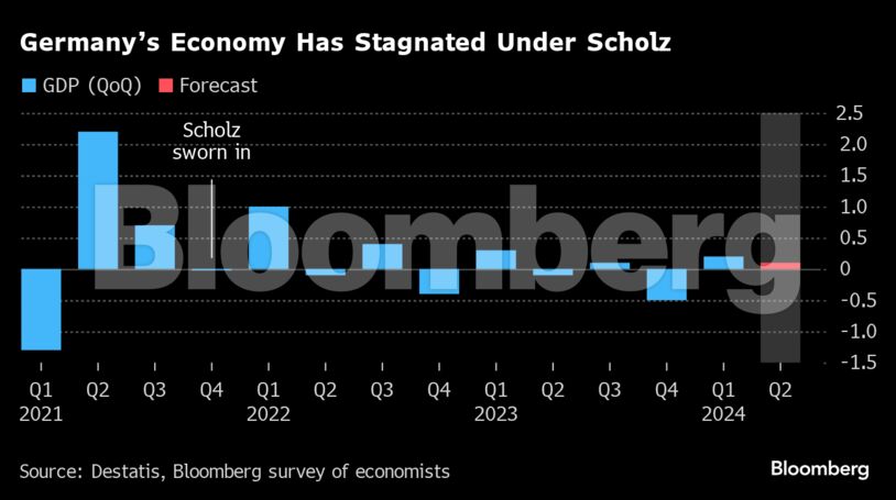 Από τις 10 τριμηνιαίες μετρήσεις του ΑΕΠ από τότε που ανέλαβε τα καθήκοντά του ο Σολτς, περισσότερες από τις μισές έδειξαν είτε σχεδόν μηδενική ανάπτυξη είτε συρρίκνωση.