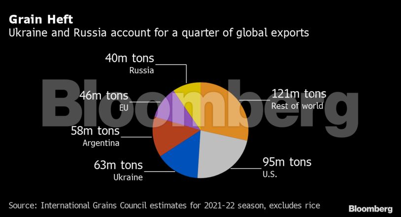 Κρίση ενδέχεται να προκληθεί και στις τιμές των τροφίμων. Τόσο η Ουκρανία όσο και η Ρωσία παράγουν τεράστιο όγκο σίτου, καλαμποκιού και ηλιελαίου. Μεγάλος αριθμός χωρών από την Ασία, μέχρι την Αφρική και τη Μέση Ανατολή ενδέχεται να κληθούν να αντιμετωπίσουν περαιτέρω αύξηση των τιμών βασικών τροφίμων όπως το ψωμί και το κρέας τη στιγμή που οι τιμές αυτές βρίσκονται σε υψηλό 10ετίας.
