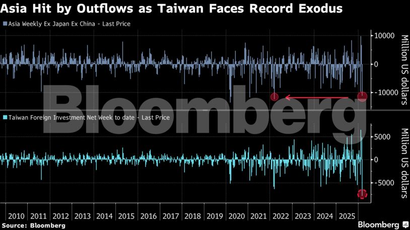 Τα παγκόσμια κεφάλαια πούλησαν 11 δισεκατομμύρια δολάρια σε μετοχές της αναπτυσσόμενης Ασίας, εξαιρουμένης της Κίνας, αυτήν την εβδομάδα, γεγονός που καταγράφει τη μεγαλύτερη εκροή από τον Μάρτιο του 2022, σύμφωνα με τα δεδομένα που συγκέντρωσε το Bloomberg. Η εκροή αυτή περιλαμβάνει ρεκόρ 7,9 δισεκατομμυρίων δολαρίων από την Ταϊβάν, περίπου 1,6 δισεκατομμύρια από τη Νότια Κορέα και περίπου 1,3 δισεκατομμύρια από την Ινδία.