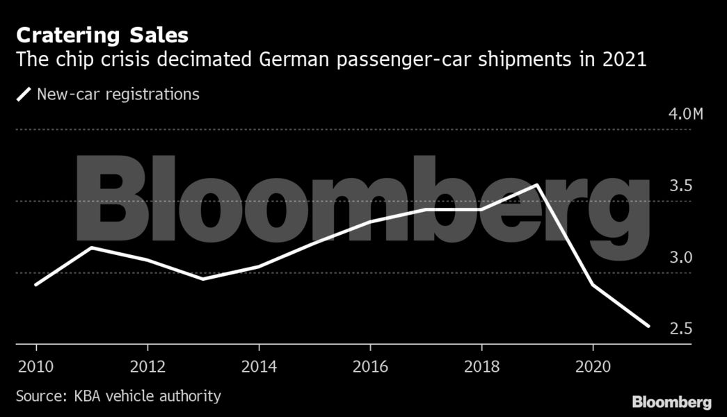 Οι πωλήσεις αυτοκινήτων στη Γερμανία υποχώρησαν πέρυσι στο χαμηλότερο επίπεδο από το 1990, καθώς η κρίση στις εφοδιαστικές αλυσίδες διέψευσε τις ελπίδες για ανάκαμψη από την πανδημία.