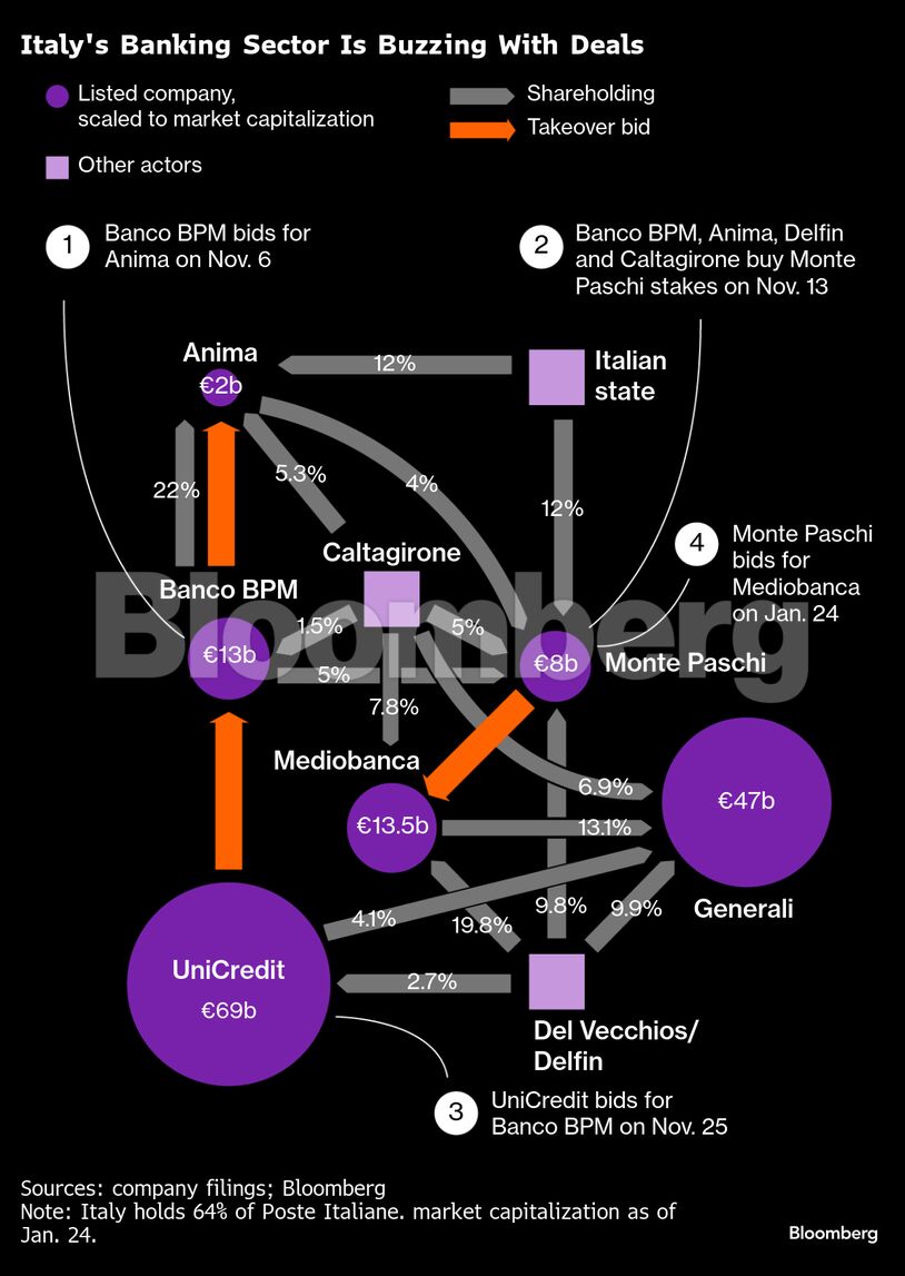 Ο τραπεζικός τομέας της Ιταλίας βιώνει ένα υψηλό επίπεδο δραστηριότητας συγχωνεύσεων και εξαγορών που ξεκίνησε στις αρχές Νοεμβρίου, όταν η Banco BPM SpA υπέβαλε προσφορά για τη διαχειρίστρια περιουσιακών στοιχείων Anima Holding SpA, για να γίνει η ίδια στόχος λίγες εβδομάδες αργότερα, όταν η αντίπαλη UniCredit SpA υπέβαλε προσφορά.