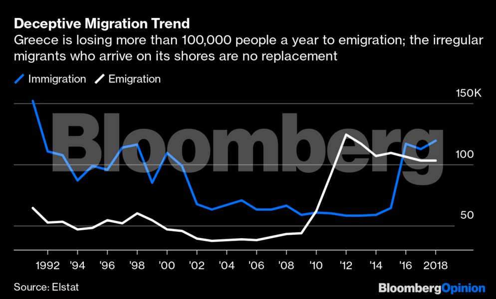 Σύμφωνα με την ΕΛΣΤΑΤ, η μετανάστευση ήταν αυξημένη τα τελευταία χρόνια, αλλά αυτό είναι περισσότερο ένα πρόβλημα παρά μια ευτυχής εξέλιξη. Οι Έλληνες εγκαταλείπουν τη χώρα η οποία αριθμεί περίπου 11 εκατομμύρια πληθυσμό, με ρυθμό άνω των 100.000 ετησίως από την έναρξη της κρίσης. Η εκροή αυτή αντισταθμίστηκε μόνο από την άφιξη των μεταναστών από τη Μέση Ανατολή και την Αφρική κατά τη διάρκεια του πρόσφατου κύματος προσφύγων – ένα βάρος που η Ελλάδα αγωνίζεται να διαχειριστεί.