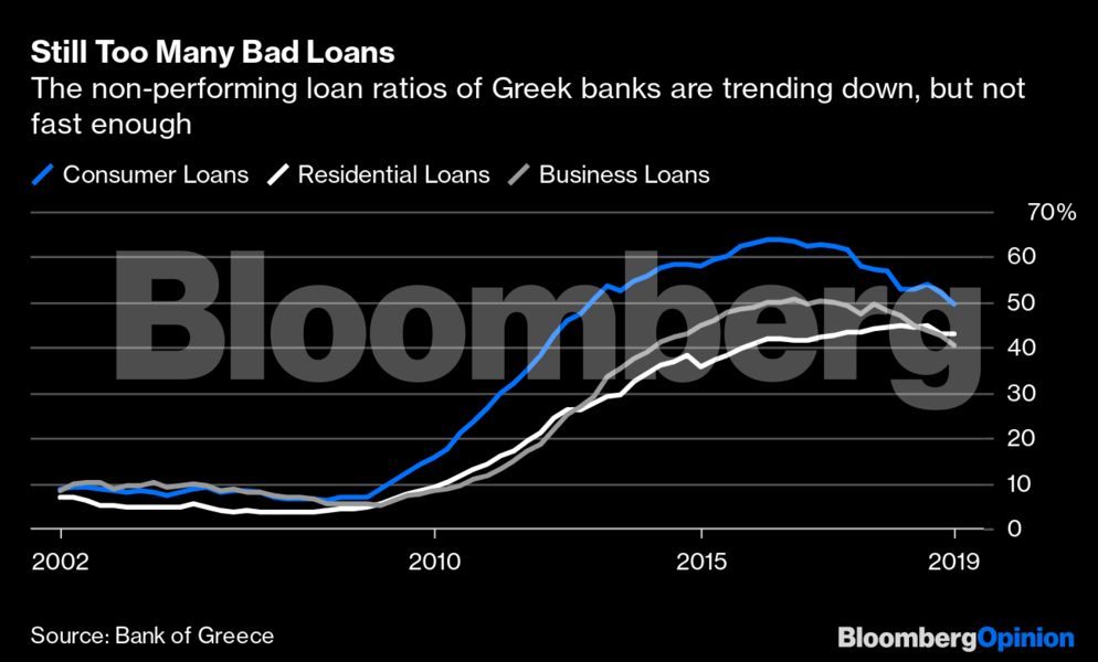 Επιπλέον, σε αντίθεση με τα ανατολικοευρωπαϊκά πιστωτικά ιδρύματα, οι ελληνικές τράπεζες επιβαρύνονται με τεράστια ποσά μη εξυπηρετούμενων δανείων, τα οποία δεν μειώνονται αρκετά γρήγορα ώστε να επιτρέψουν στις τράπεζες να επεκτείνουν την πίστωση. Ο δείκτης κακής πίστης του ελληνικού τραπεζικού συστήματος διαμορφώθηκε σε 42,1% το Σεπτέμβριο, τον τελευταίο μήνα για τον οποίο υπάρχουν διαθέσιμα στοιχεία. Στη Ρουμανία, ο λόγος αυτός είναι κάτω από 5%.