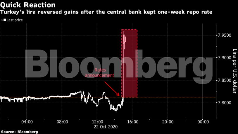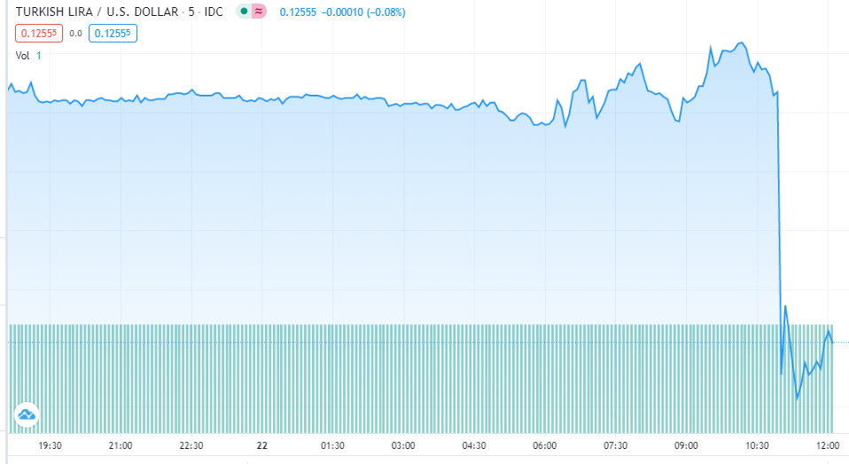 Η λίρα βυθίστηκε σε χαμηλό ρεκόρ, κοντά στο 8 ανά δολάριο, καθώς η κεντρική τράπεζα της Τουρκίας, ακούγοντας τις εντολές Ερντογάν, δεν αύξησε το βασικό της επιτόκιο όπως αναμένονταν.