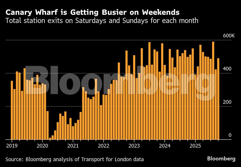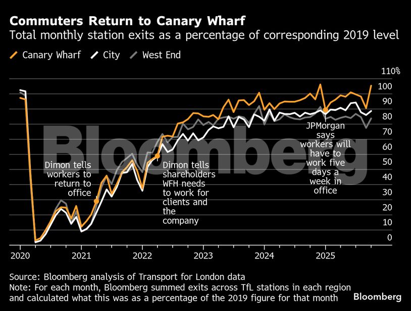 Σύμφωνα με ανάλυση του Bloomberg με βάση στοιχεία της Transport for London, τον Οκτώβριο πραγματοποιήθηκαν κατά μέσο όρο περίπου 91.000 καθημερινές διαδρομές με το μετρό, την Elizabeth Line και το Docklands Light Railway προς τους σταθμούς του Canary Wharf, ξεπερνώντας τον αριθμό του αντίστοιχου μήνα το 2019. Αυτό ξεπερνά την ανάκαμψη του αριθμού των επισκεπτών σε σχέση με άλλες σημαντικές επιχειρηματικές περιοχές του Λονδίνου, όπως το City και το West End, όπου μια πιο διαφοροποιημένη ομάδα ενοικιαστών, όπως εταιρείες τεχνολογίας και μέσων ενημέρωσης, έχει υιοθετήσει μια διαφορετική προσέγγιση όσον αφορά την επιστροφή στο γραφείο.