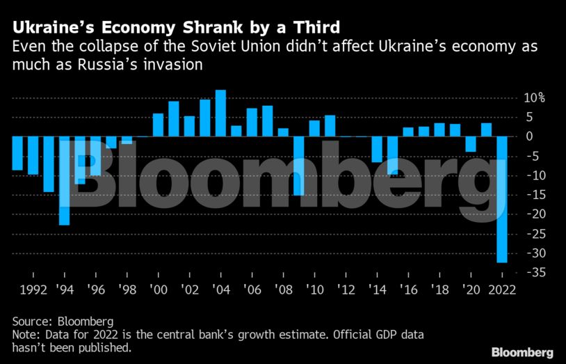 H ρωσική εισβολή έχει πλήξει ανεπανόρθωτα την ουκρανική οικονομία. Σύμφωνα με την κεντρική τράπεζα της χώρας, το ΑΕΠ της Ουκρανίας θα αυξηθεί μόλις κατά 0,3%, ενώ η οικονομία θα ανακάμψει μόνο όταν σταματήσει η γεωπολιτική ένταση.