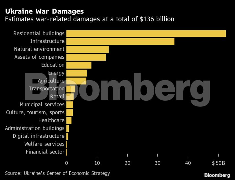Τέλος, η Ουκρανία υπολογίζει πως οι μεγαλύτερες ζημιές οι οποίες προκλήθηκαν από τους ρωσικούς πυραύλους δεν αφορούσαν στρατιωτικούς στόχους αλλά σπίτια αμάχων και ιδιωτικές επιχειρήσεις. Ο ρωσικός στρατός στοχοποίησε και διέλυσε δρόμους, υποδομές ηλεκτροδότησης και γέφυρες. Βαρύ ήταν και το πλήγμα που κατάφεραν οι Ρώσοι στο ίδιο το περιβάλλον, λόγω της ναρκοθέτησης χιλιάδων στρεμμάτων ξηράς αλλά και των θανάτων θαλάσσιας πανίδας στη Μαύρη Θάλασσα.
