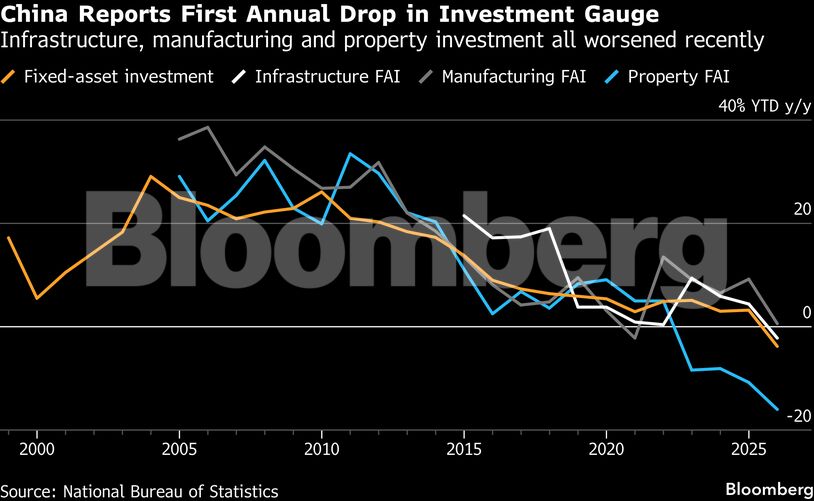 Η εγχώρια ζήτηση ήταν υποτονική πέρυσι, ειδικά αν εξαιρέσουμε τις επιπτώσεις των επιδοτήσεων της κυβέρνησης ύψους 300 δισεκατομμυρίων γουάν (43 δισεκατομμύρια δολάρια) για την αγορά καταναλωτικών αγαθών από τα νοικοκυριά. Οι επενδύσεις συρρικνώθηκαν τον Δεκέμβριο με τον ταχύτερο ρυθμό που παρατηρήθηκε πέρυσι, παρά τα μέτρια μέτρα τόνωσης που προστέθηκαν στα τέλη του 2025, σύμφωνα με την Ζακλίν Ρονγκ, επικεφαλής οικονομολόγο της BNP Paribas SA για την Κίνα.