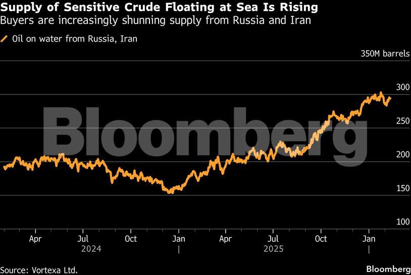 Σύμφωνα με την εταιρεία παρακολούθησης πλοίων Vortexa Ltd, υπάρχουν περίπου 292 εκατομμύρια βαρέλια ρωσικού και ιρανικού αργού πετρελαίου στη θάλασσα, ποσοστό 50% υψηλότερο από ό,τι πριν από ένα χρόνο. Από το ποσό αυτό, 140,5 εκατομμύρια βαρέλια είναι ρωσικά — σχεδόν διπλάσια από το περσινό επίπεδο — ενώ 151 εκατομμύρια είναι ιρανικά, σύμφωνα με τα στοιχεία.