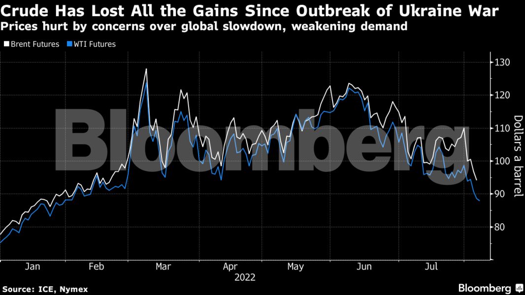 Μετά την ανοδική πορεία τους πρώτους πέντε μήνες του έτους, το αργό κινήθηκε πτωτικά, με τις απώλειες να διευρύνονται αυτόν τον μήνα μετά και την υποχώρηση του Ιουνίου και του Ιουλίου. Το sell-off, το οποίο έχει εξαλείψει τα κέρδη που που έφερε η εισβολή της Ρωσίας στην Ουκρανία, θα αμβλύνει τις πληθωριστικές πιέσεις στην παγκόσμια οικονομία.