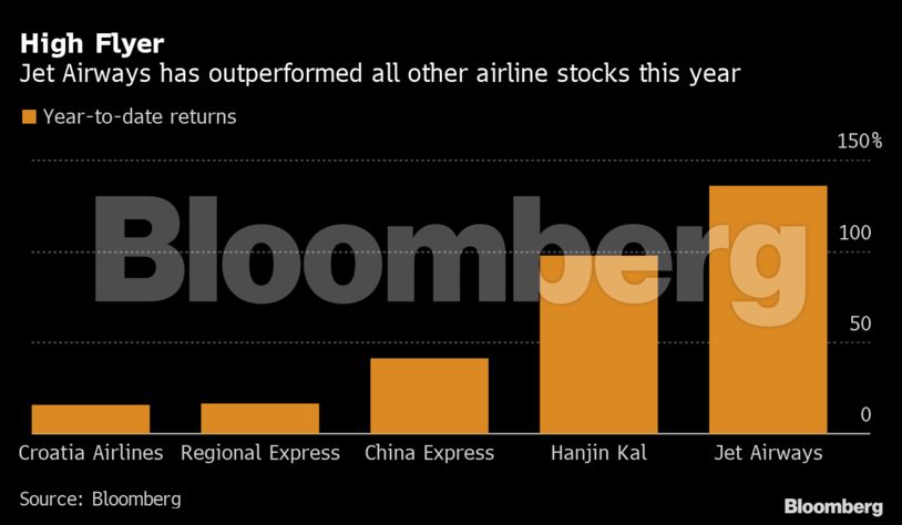 Σύμφωνα με το Bloomberg World Airlines Index, οι μετοχές της Jet Airways India με έδρα τη Βομβάη σημείωσαν άνοδο σχεδόν 150% φέτος έναντι 42% σε σχέση με το 2019.