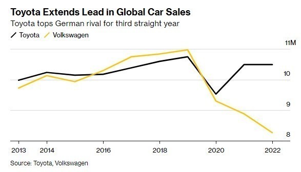 Τα σκήπτρα στις παγκόσμιες πωλήσεις Ι.Χ. αυτοκινήτων διατήρησε και το 2022 η Toyota Motor, η οποία κατάφερε να διευρύνει την απόσταση από τη δεύτερη Volkswagen, παρά τις αναταράξεις στις εφοδιαστικές αλυσίδες.