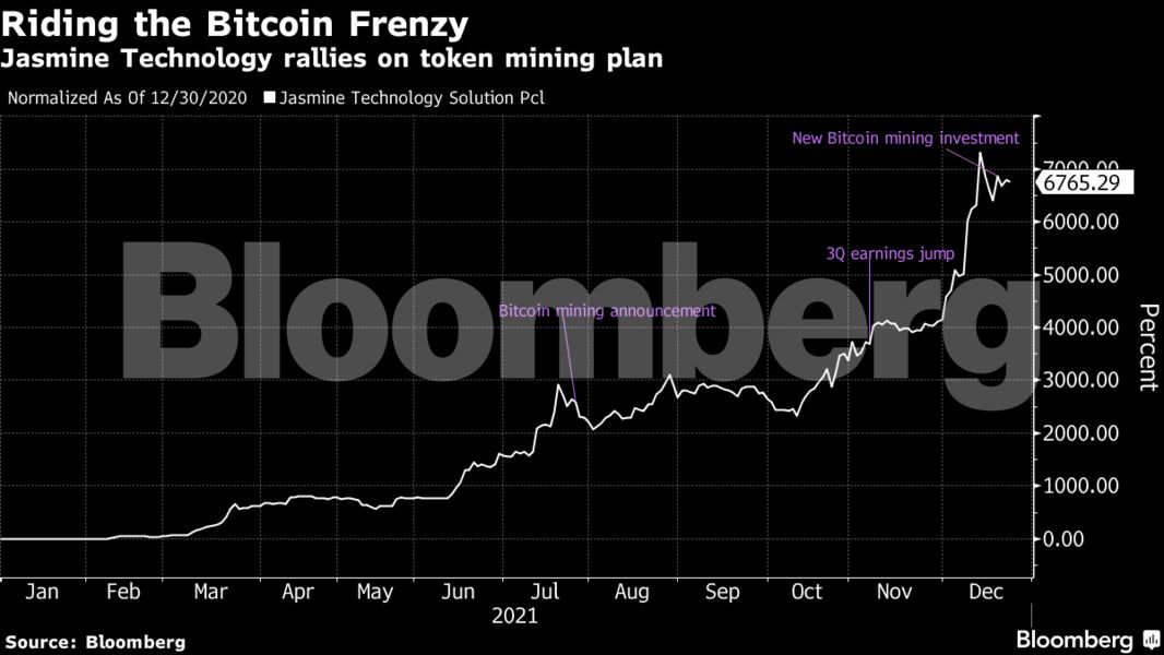 Η Jasmine Technology έχει παράγει μόνο οκτώ Bitcoins από τις 325 μηχανές εξόρυξης που διαθέτει από τότε που ξεκίνησε τις εργασίες της πριν από μερικούς μήνες. Ο Soraj αναμένει ότι το επόμενο έτος θα είναι πολύ πιο ενεργό, λόγω των σχεδίων να επενδύσει περίπου 3,3 δισεκατομμύρια μπατ (98 εκατομμύρια δολάρια) σε όσο το δυνατόν περισσότερες νέες 7.000 συσκευές. Τα έσοδα από την επιχείρηση εξόρυξης θα αντιπροσωπεύουν περίπου το 80% του συνολικού κύκλου εργασιών της εταιρείας μέχρι τα τέλη του 2022, είπε.