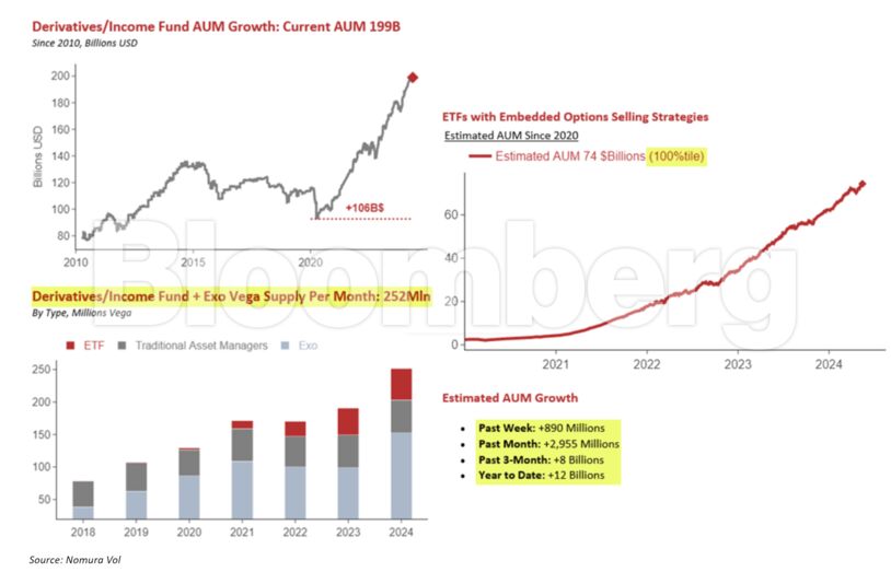Εν τω μεταξύ, η «στρατιά» των sellers της μεταβλητότητας γίνεται μεγαλύτερος μήνα με το μήνα, με τα υπό διαχείριση περιουσιακά στοιχεία σε αμοιβαία κεφάλαια εισοδήματος παραγώγων να ανέρχονται πλέον σε 200 δισεκατομμύρια δολάρια. Παρέχουν περισσότερα από 250 εκατομμύρια συναλλαγές τύπου vega στην αγορά κάθε μήνα, καταστέλλοντας τη μεταβλητότητα με πρωτοφανή τρόπο.