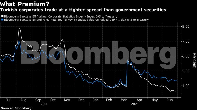 Η εξέλιξη των τουρκικών εταιρικών ομολόγων σημαίνει ότι οι τουρκικές εταιρείες πληρώνουν λιγότερο, κατά μέσο όρο 78 μονάδες βάσης, από την τουρκική κυβέρνηση για να δανειστούν. Πρόκειται για τη μεγαλύτερη διαφορά από το 2010 και υπογραμμίζει τη δυναμική του ράλι στο οποίο έχουν επιδοθεί οι επενδυτές με τοποθετήσεις υψηλού ρίσκου για την αποκόμιση κερδών.