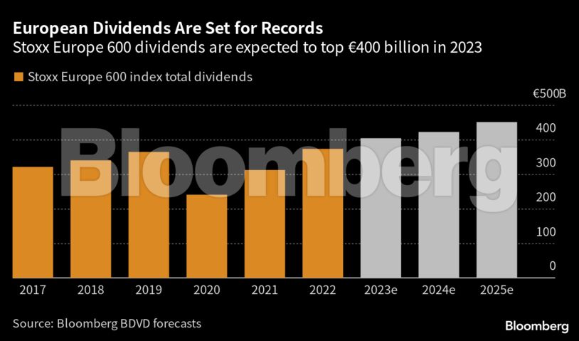 Τα μερίσματα κατέγραψαν αύξηση της τάξης του 12% στα $327 δισεκατομμύρια το α’ τρίμηνο, σύμφωνα με την Janus Henderson Investors, ενώ οι ευρωπαϊκές αγορές ενδέχεται να επιτύχουν υψηλό ρεκόρ ετήσιων πληρωμών μερισμάτων, με το ποσό του δείκτη Stoxx Europe 600 να αναμένεται να ξεπεράσει τα 400 δισ. ευρώ το 2023, σύμφωνα με τις εκτιμήσεις του Bloomberg.