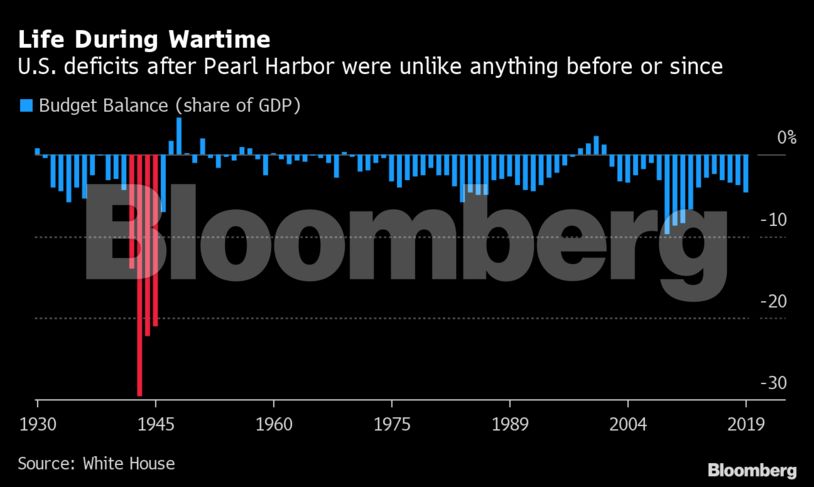 Ο Ντόναλντ Τραμπ αναγνώρισε την ανάγκη να «προχωρήσει» και πιέζει για ένα πακέτο 1,3 τρισεκατομμυρίων δολαρίων το οποίο θα περιλαμβάνει επιταγές ενίσχυσης των Αμερικανών πολιτών, διασώσεις σε κλάδους της αγοράς όπως οι αεροπορικές εταιρείες και στήριξη των επιχειρήσεων που έχουν κλείσει. Ηδη τέτοια προγράμματα έχουν τεθεί σε εφαρμογή στο Παρίσι και με καθυστέρηση στο Λονδίνο. Ολοι μιλούν τη γλώσσα του πολέμου. Οι αριθμοί λένε ότι έχουν δίκιο.”Αυτό είναι πιθανό να είναι η μεγαλύτερη κινητοποίηση του δημόσιου τομέα σε μια μόνο εβδομάδα – ως ποσοστό του ακαθάριστου εγχώριου προϊόντος – από τον Δεύτερο Παγκόσμιο Πόλεμο», δήλωσε ο Ντέιβιντ Μαν, επικεφαλής οικονομολόγος της Standard Chartered Plc. «Τουλάχιστον για τις ΗΠΑ και την Ευρώπη. Και αν η κλίμακα των σχεδίων πολιτικής προκαλεί τέτοιες ιστορικές συγκρίσεις, το ίδιο συμβαίνει και με το εμπόριο .Η JPMorgan Chase & Co. λέει στους πελάτες της να είναι έτοιμοι για πτώση της τάξης του 40% στην κινεζική παραγωγή το πρώτο τρίμηνο, πτώση 14% στις ΗΠΑ κατά τη διάρκεια των επόμενων τριών μηνών – στοιχεία που δεν έχουμε δει εδώ και 50 χρόνια.