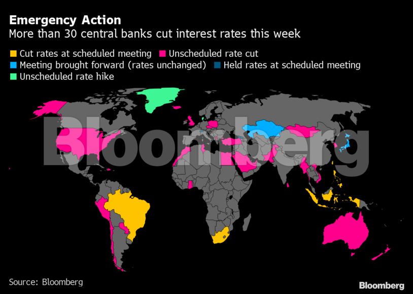 Καθώς η εβδομάδα φτάνει στο τέλος, 31 Κεντρικές Τράπεζες έχουν ήδη προχωρήσει σε κινήσεις χωρίς προηγούμενο μειώνοντας επιτόκια, πολλές από αυτές έχουν προχωρήσει περισσότερο ενεργοποιώντας έκτακτα μέτρα για την αντιμετώπιση της κρίσης αγοράζοντας ομόλογα, παρεμβαίνοντας στις αγορές συναλλάγματος και δημιουργώντας προγράμματα έκτακτης δανειοδότησης για τράπεζες και εταιρείες.