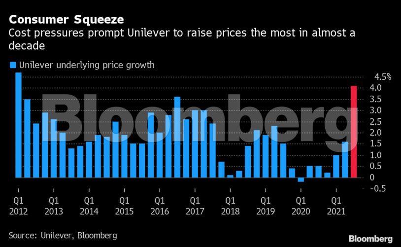 Η εταιρεία η οποία παράγει προϊόντα όπως το σαπούνι «Dove», τα παγωτά «Magnum» και το τσάι «Lipton», ανακοίνωσε αύξηση των τιμών των προϊόντων της κατά 4,1% το τρίτο τρίμηνο του 2021. Επιπροσθέτως, ο CEO της εταιρείας Alan Jope προέβλεψε τουλάχιστον 12 μήνες πληθωρισμού: «ο πληθωρισμός θα φτάσει στο ζενίθ του το πρώτο εξάμηνο του 2022 και θα μειωθεί προς το τέλος του επόμενου έτους».